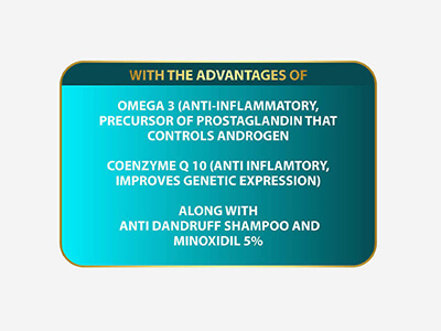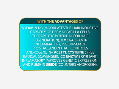 *OMEGA - 3 (anti inflammatory, precursor of prostaglandin that controls androgen) and essential nutrients for fitness.